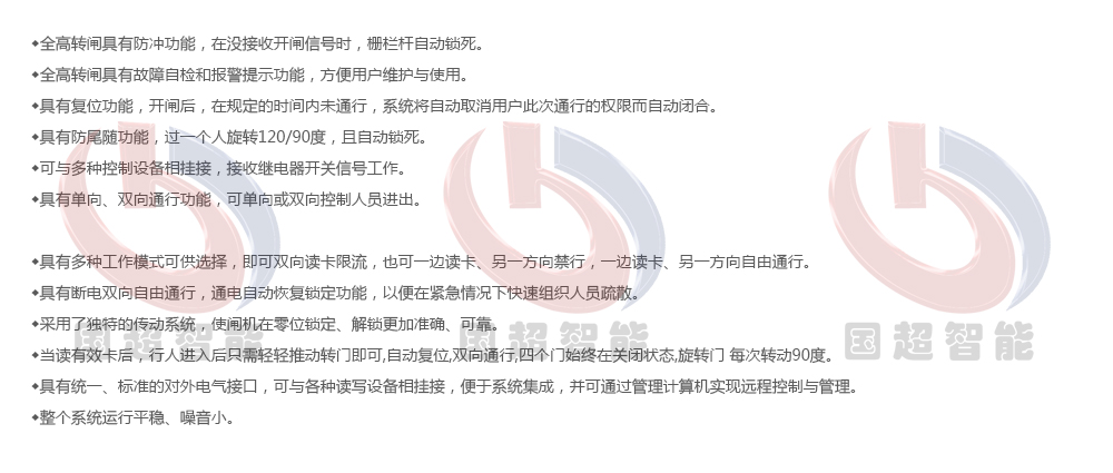 全高轉(zhuǎn)閘可為出入人員提供有序文明的通行方式、杜絕非法出入、擺臂運行平穩(wěn)、低躁音。全高轉(zhuǎn)閘可以和各式出入控制裝置,如ID卡、IC卡、條碼卡、手機(jī)SIM、門禁、指紋機(jī)、掌型儀、人臉識別等識別方式集成一體使用。